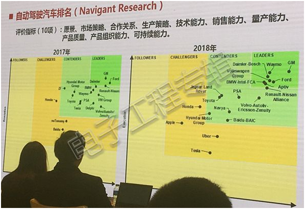 從技術成熟度上來看,頭部企業進展迅猛,但由此帶來的兩極分化也很明顯,除了那些我們熟悉的大廠,其他都在做分母。產業化能力上,傳統車企占據優勢,在成波教授曬出的一張圖上,我們看到美國研究咨詢公司Navigant Research對2018年自動駕駛企業做的一個排名,通用汽車、福特、大眾、寶馬、戴姆勒等傳統車企處于第一梯隊,而Waymo、Aptiv這些技術性新興企業也表現搶眼。