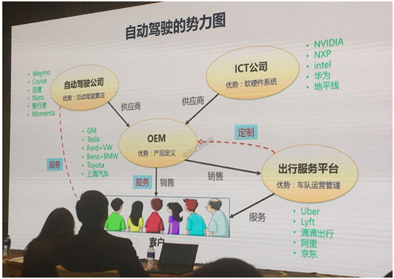 主機廠處于弱勢,又沒有自動駕駛需要相關的團隊、技術、市場,怎么辦?組織生態聯盟自救,逐漸就形成了上圖的一個勢力圖。一個是原來占龍頭地位的主機廠OEM;一個是做自動駕駛方案的,以Waymo、Cruise、百度、Momenta這些初創公司為代表的;再來是英偉達、英特爾、華為、地平線這些做ICT,以及博世這類做芯片、操作系統、平臺、架構的公司,主導軟硬件系統;還有一個新勢力就是出行平臺,像Uber、滴滴,物流方面阿里和京東也進入了。
