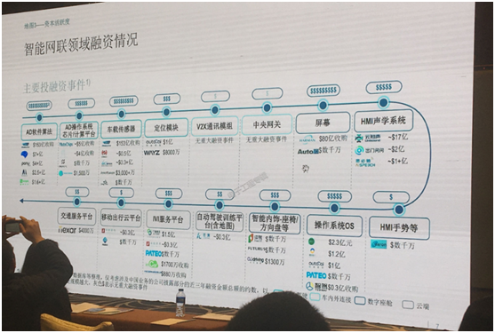 下圖是基于2017年的數據,我們可以看到,像軟件算法、車載傳感器、屏幕都是投資熱點,大家可以在里面得到一些啟示。
