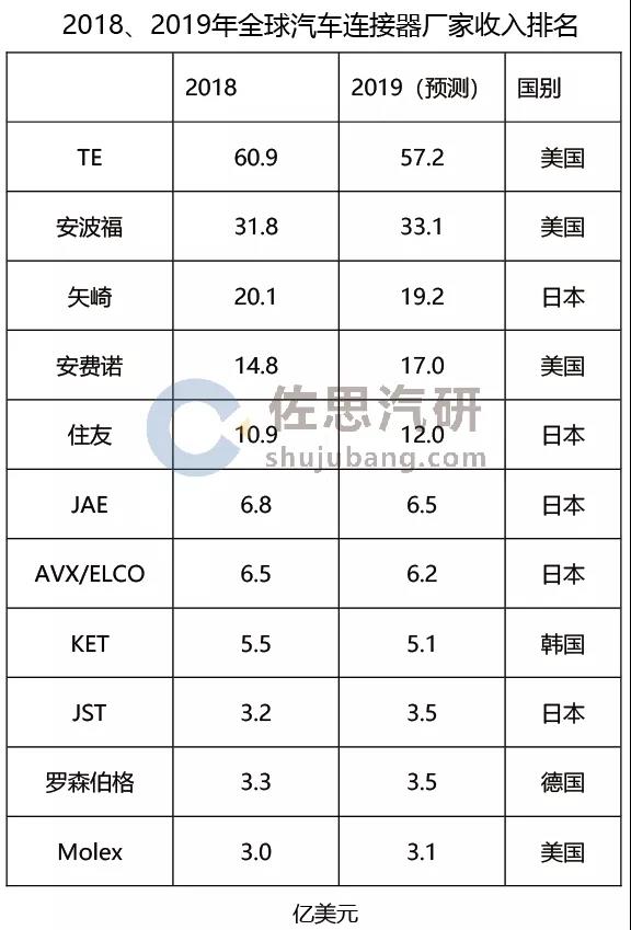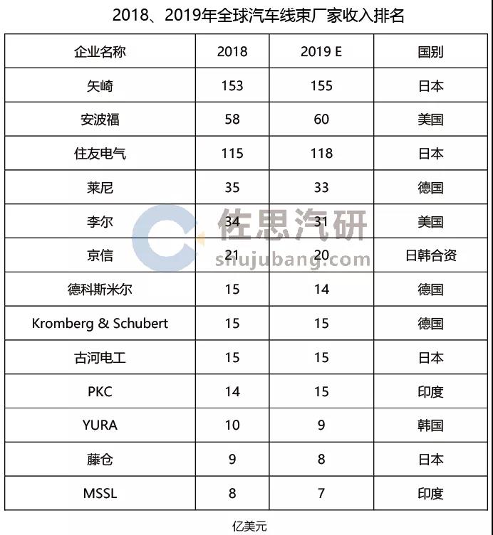 2018、2019年全球汽車線束廠家收入排名
