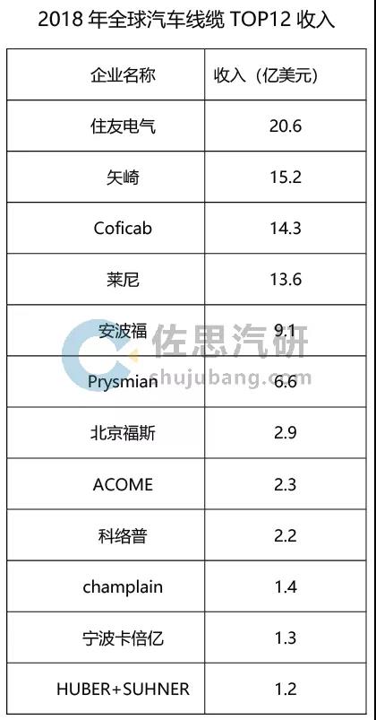 2018年全球汽車線纜TOP 12收入